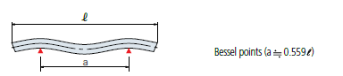 The change in length of a bar (or micrometer) due to bending can be minimized by spacing the two supports symmetrically as shown above. These points are known as the ‘Bessel Points’ and may be useful when using a long inside micrometer.